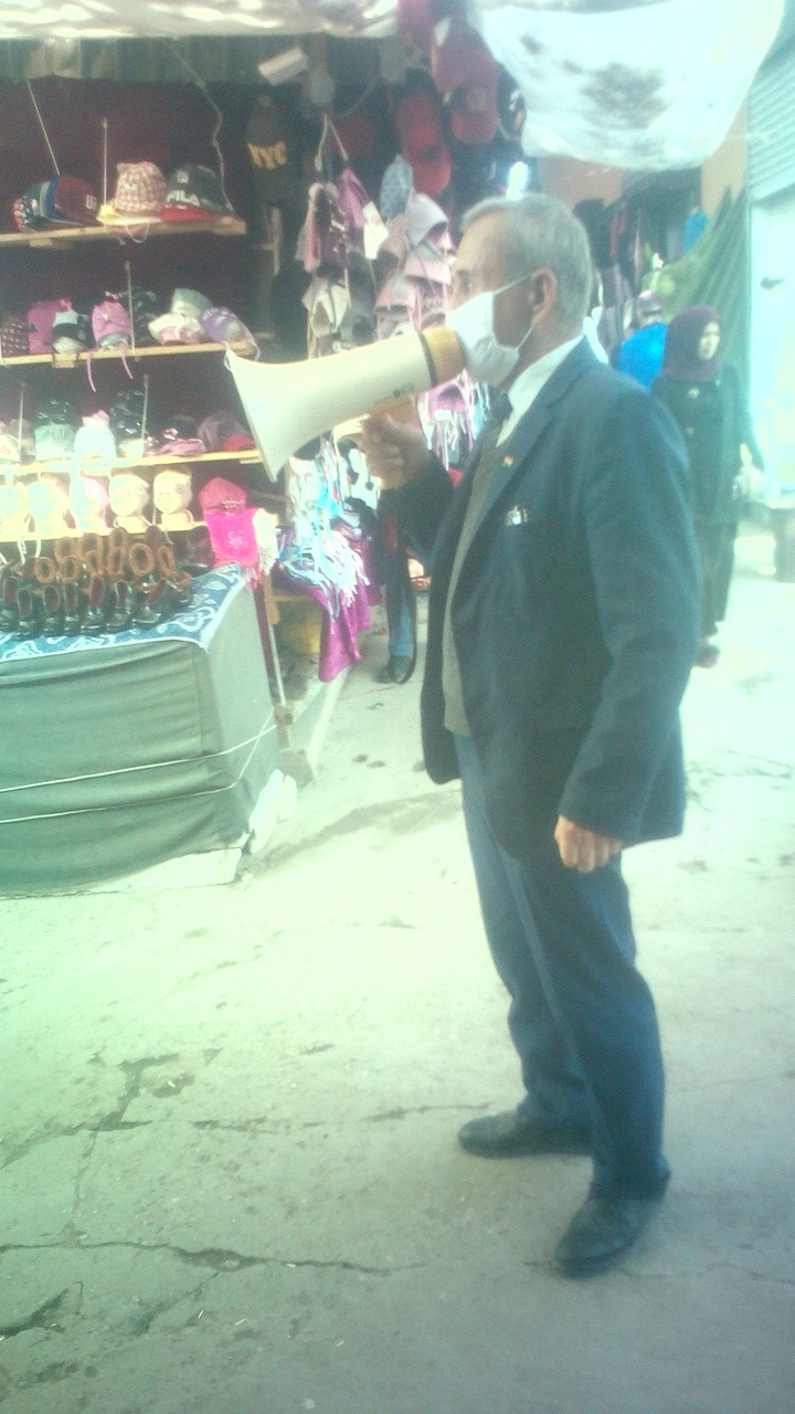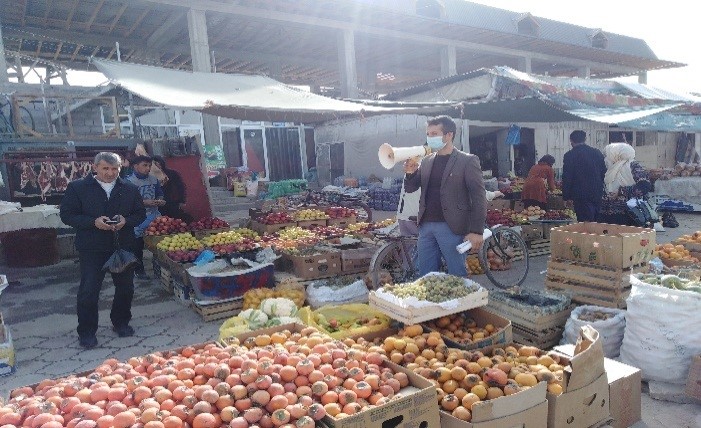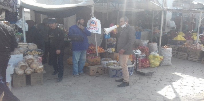 Корҳои оммафаҳмонӣ бо истифода аз баландгӯяк оиди пешгирии бемории сироятии коронавирус дар бозори марказии ноҳияи Ёвон